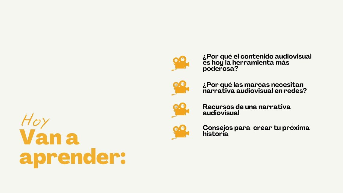 Vas a tener conocimientos Cinematográficos, pero bajados a herramientas simples y aplicables para que cualquier CM, emprendedor o marketer pueda crear videos que enganchen.
